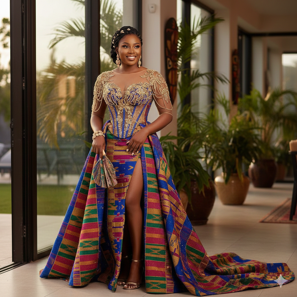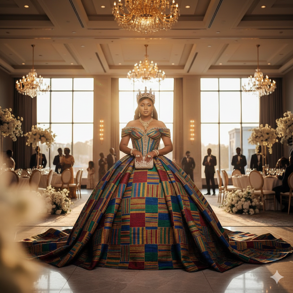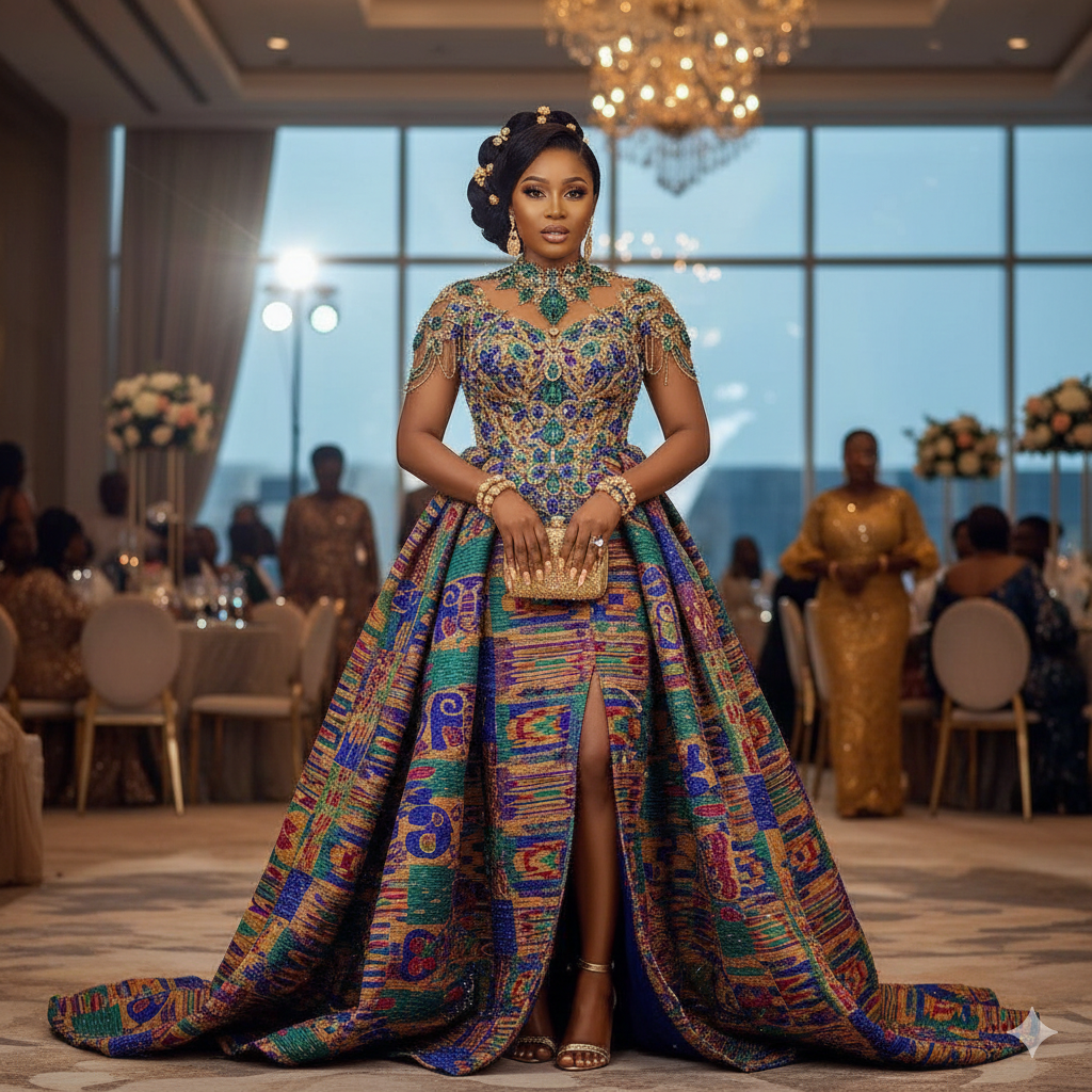 3. Modern Royalty: Kente Gowns with Dramatic Silhouettes