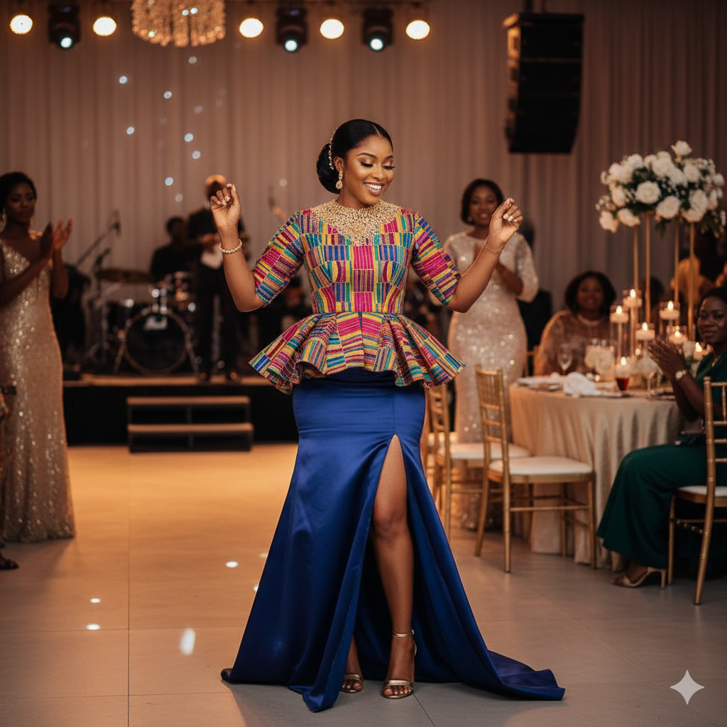 While your main engagement Kente is often a showstopper, many brides opt for a second, more comfortable yet equally stylish outfit for the reception. Think shorter Kente dresses, elegant Kente peplum tops with flowing skirts, or even sophisticated Kente jumpsuits. These allow for easier movement while still keeping the cultural essence.