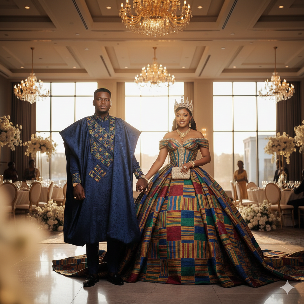 We can’t forget the grooms! Matching Kente outfits for couples are a beautiful way to show unity and cultural pride. From Kente embroidered Agbada styles to perfectly coordinated Kente accents, grooms are stepping up their fashion game.