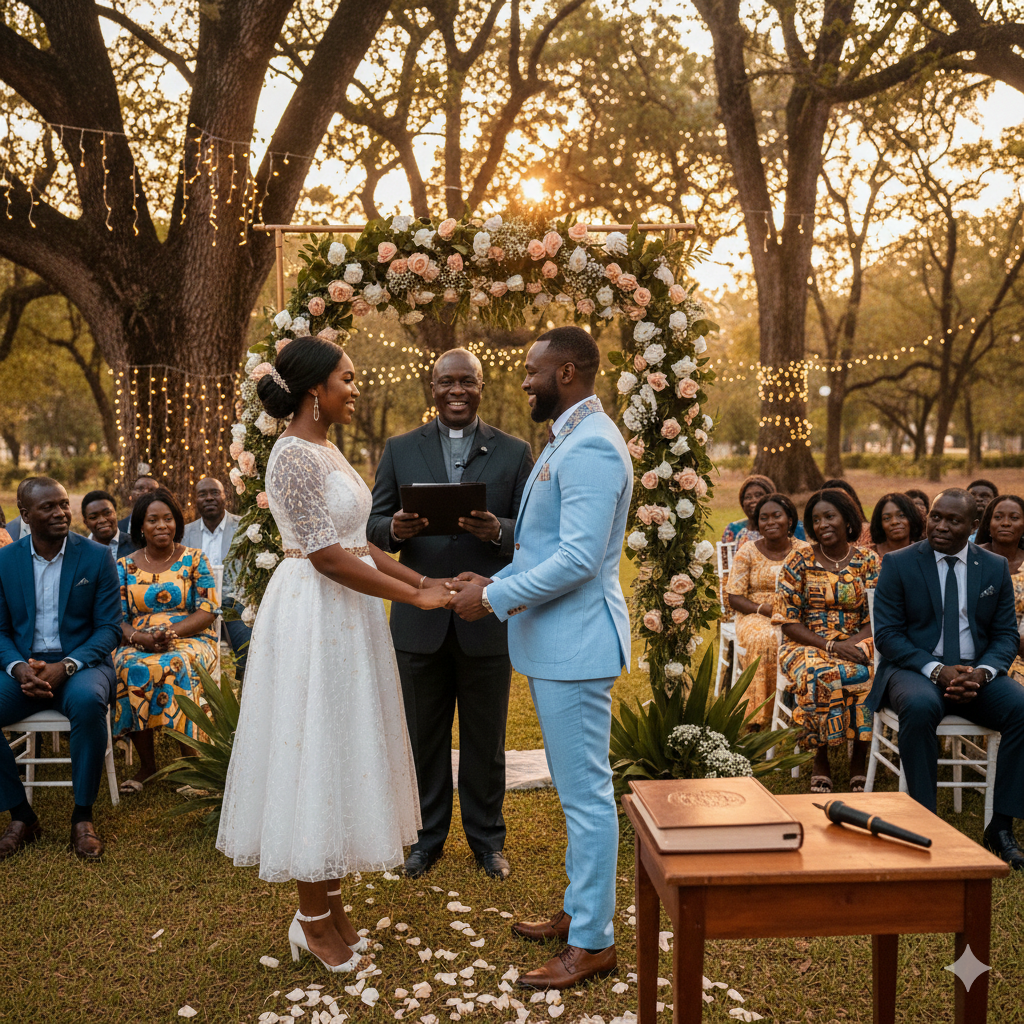 In Ghana, many couples perform a “double” ceremony: the Traditional Wedding (the “Knocking” and engagement) to satisfy family and cultural rites, followed by the Civil/Ordinance Wedding to secure legal rights.